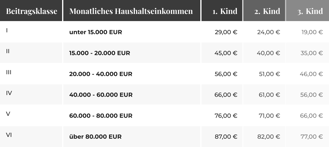 Mit Ausnahme der höchsten Beitragsklasse von 87 Euro/Monat muss bei Anmeldung ein Einkommensnachweis erbracht werden. Die Einstufung in die Beitragsklasse erfolgt vorbehaltlich und wird ggf. überprüft.